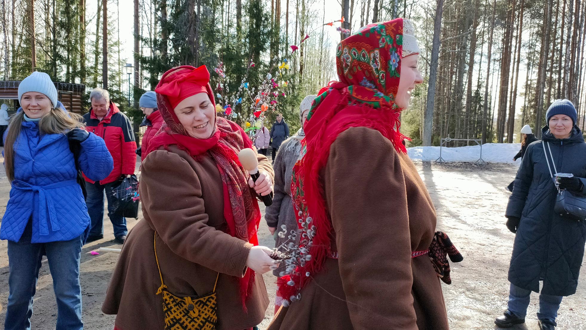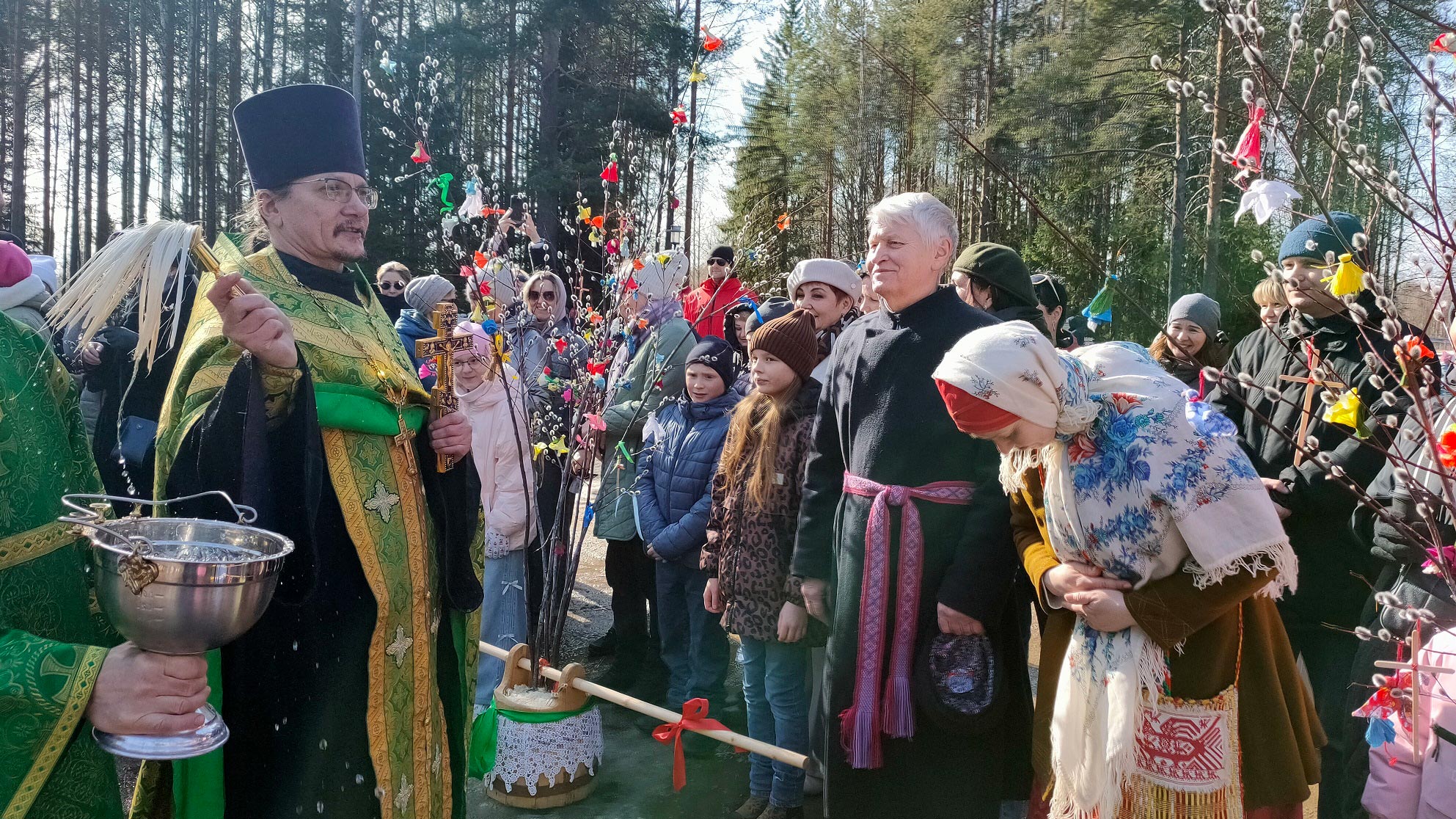 В этот день в Каргопольско-Онежском секторе музея-заповедника «Малые Корелы» состоялась праздничная программа. Настоятель Успенского храма д. Новинки Приморского округа иерей Владимир Логинов провёл на центральной площади водосвятный молебен, напомнил собравшимся, как правильно называется праздник, и по сложившейся на Руси традиции освятил вербные ветви.