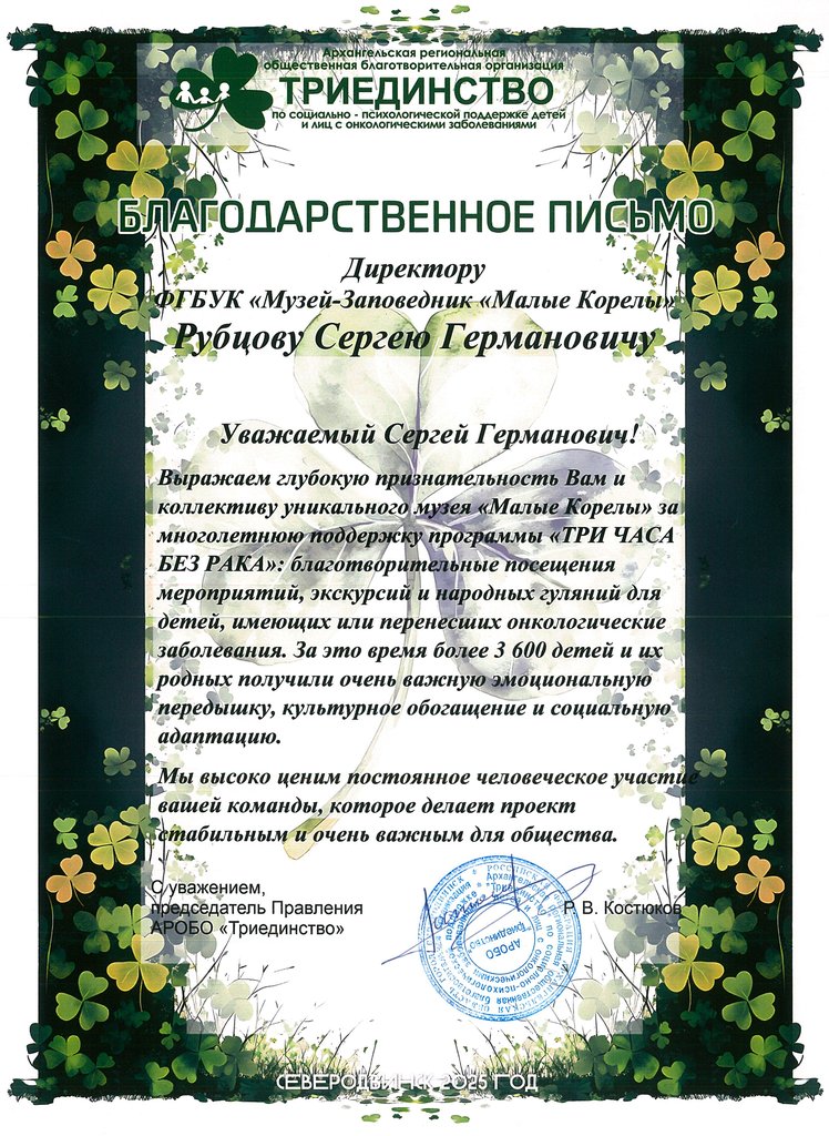 Благодарность за сотрудничество с Государственным академическим Северным русским народным хором и помощь в организации фотосессии Малого Северного хора в музее «Малые Корелы»